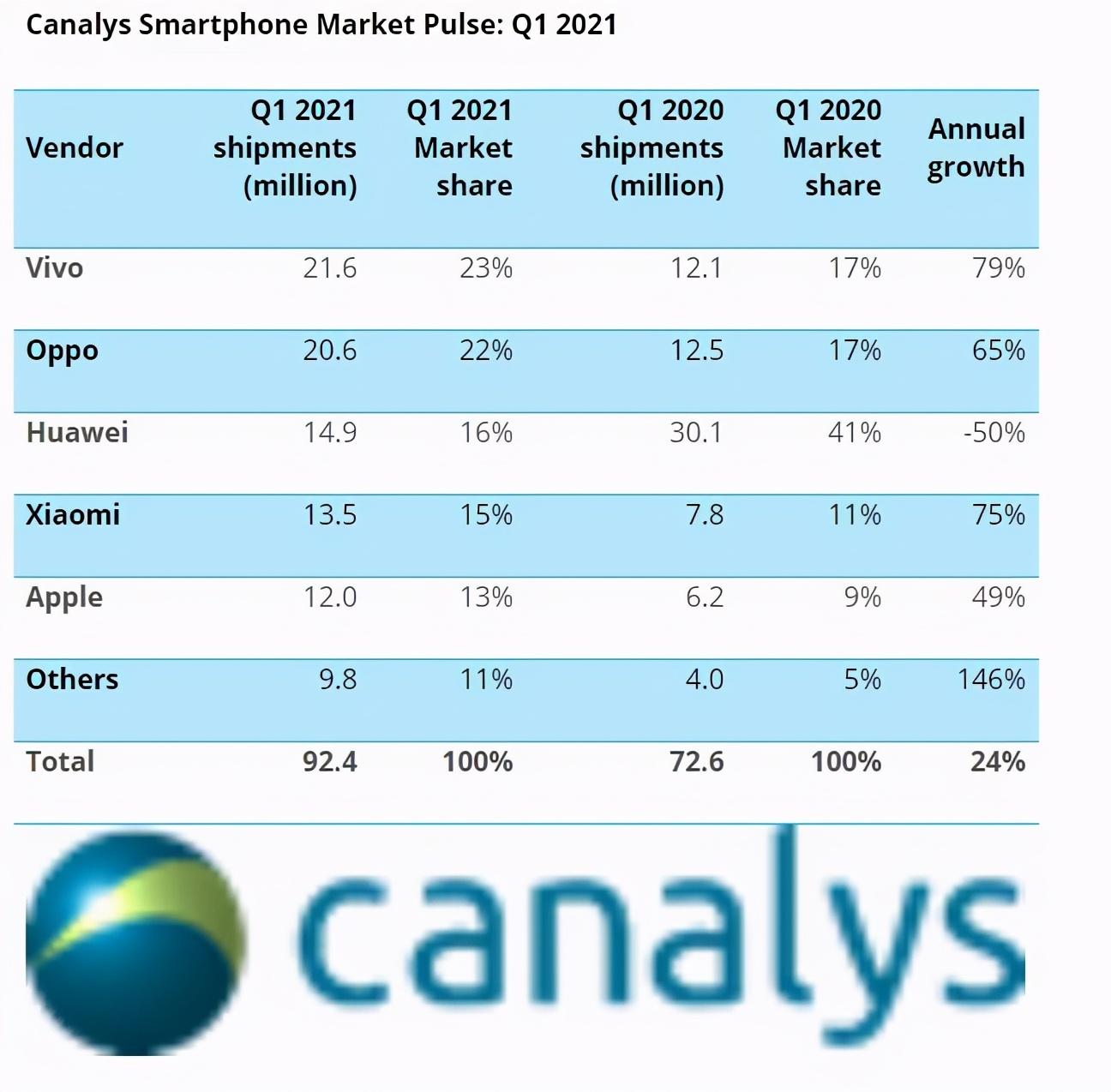 从Canalys数据可以看到,vivo 2021第一季度智能手机出货量为2160万台,同比增长高达79%,并以23%的市场占有率高居榜首。oppo紧随Vivo,出货2060万部,以22%的市场占有率屈居第二。而剥离了荣耀品牌的华为则以1490万台的出货量和14.9%的市场占有率排名第三。小米和苹果分列第四和第五,出货量分别为1350万台和1200万台。vivo和oppo合计占有了45%的市场份额,预计会继续为长安镇经济发展做出更多贡献。