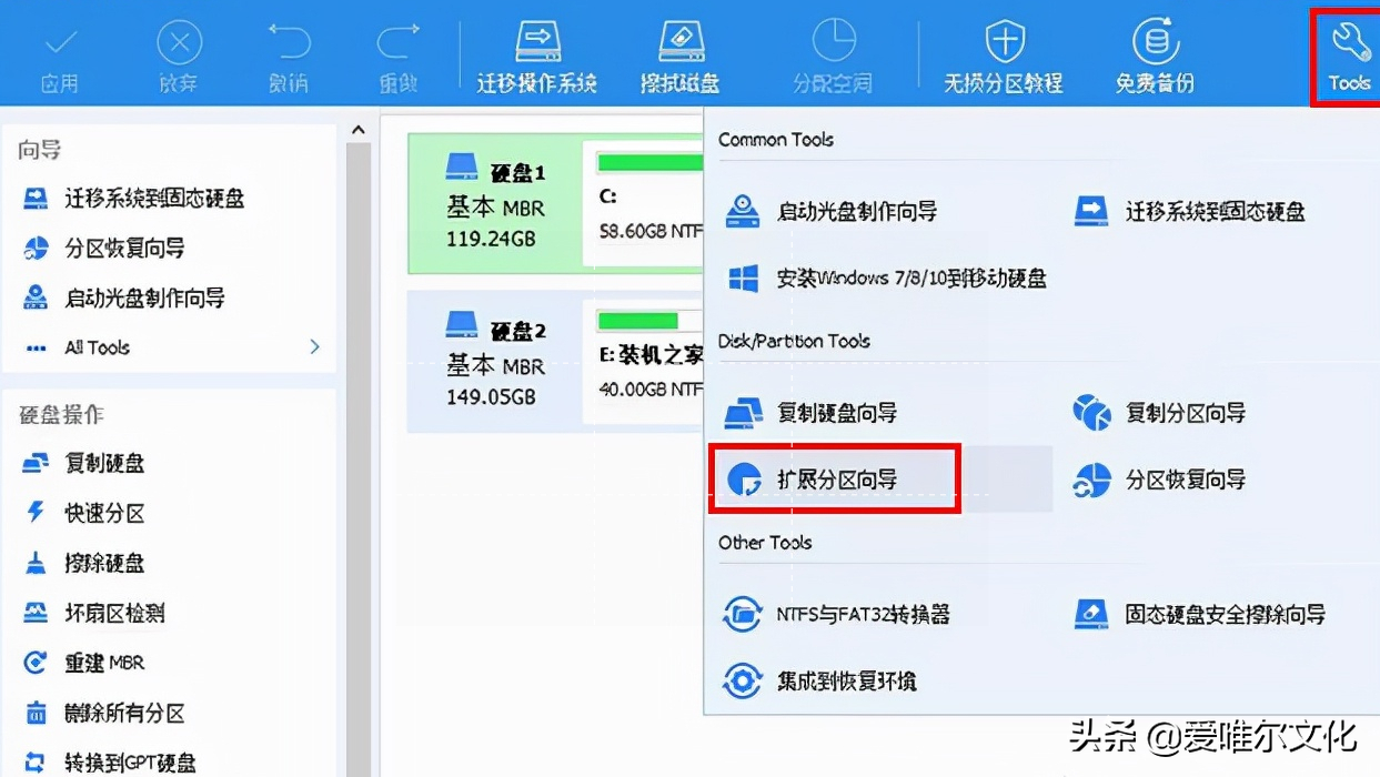 2.我们将下载好的傲梅分区助手打开,点击界面上的“Tools”(工具),再点击“扩展分区向导”,如下图所示。