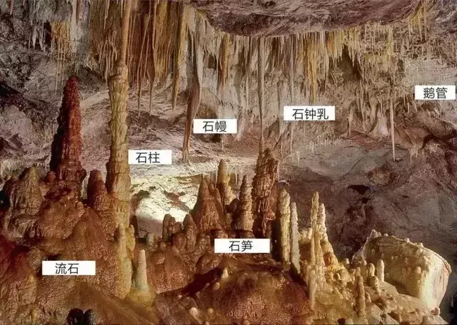 如果过饱和溶液沿着一个岩石壁流下并发生沉淀,就会形成像瀑布或者帷幕一样的钟乳石。如果溶液下滴的速度较快并流泻到稍大的范围沉积下来,就会形成莲蓬状钟乳石。有时候沉淀过程中溢出大量二氧化碳,就会在石头表面形成凹凸不平的气泡坑。钟乳石形态万千,浑然天成,绝对是大自然和时间的鬼斧神工。