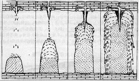 在漫长的时光中,钟乳石形成了各种各样的形态,有着我们今天能看到的丰富多彩的外观。地下水溶解并运输的物质常以过饱和的方式发生沉淀,从岩洞顶部滴下来时逐渐在底部聚集,形成溶蚀坑,当沉积物逐渐累高,就会形成溶洞滴石,从下往上生长,成为“石笋”。当滴下的过饱和沉积物在岩洞顶部沉积,就会使石钟乳呈现从上往下生长的状态。当上面的石钟乳和下面的石笋连接在一起的时候,就形成了石柱。