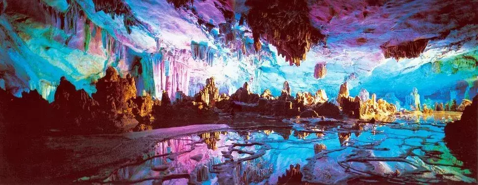 广西桂林市西北的芦笛岩溶洞中,有琳琅满目的钟乳石、石笋、石柱、石幔、石花等,这里的钟乳石以高度集中、景景相连、移步成景而著名,最宽处约有93米,最高处约18米,加上人工设置的灯光效果,使整个溶洞披上了神秘色彩,被人们称为“水晶宫”。