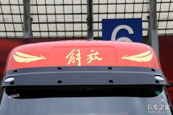 车顶贴有金色解放二字,在两侧还带有羽毛造型的拉花来装饰。车顶的下方是一块黑色的遮阳板,能阻挡阳光的直射,避免强光对驾驶员视线造成影响。遮阳板的两端为顶部示廓灯,在夜晚的时候能起到示廓作用,可以提示对面驶来的车辆。