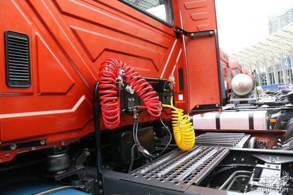 和平头的牵引车一样,挂车的气路、电路接头在驾驶室后面的龙门架上。司机在接驳挂车的时候可以便利的踩着后面工作台上。