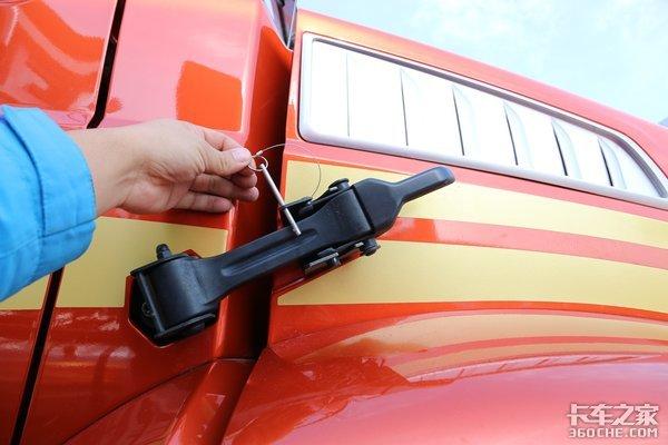 长头卡车的机舱前盖可以整体打开,在维修保养时比较便利。开启前盖,需要将锁止销拔掉(为了防止行车时锁具意外开启影响行车安全),然后向后搬动锁具即可打开前盖。这样的操作方式,是不是勾起了很多人的回忆,因为解放141就是类似的操作方式。
