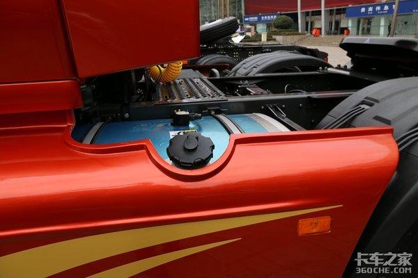 车辆的右侧围带有一个脚踏,司机可以手扶导流板后的扶手方便的上车进行接驳挂车的操作。尿素罐在右侧侧围内,加注口带有一个观察窗,能看到尿素液的加注位置。