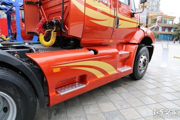 这辆车的侧面看着也非常饱满,与驾驶室同色的侧围增加了车辆的整体性。侧围上两级比较宽大的上车踏板,上面采用凸起的花纹设计,能起到增大摩擦力的作用,在上车的时候司机也可以把脚上的泥土刮掉。