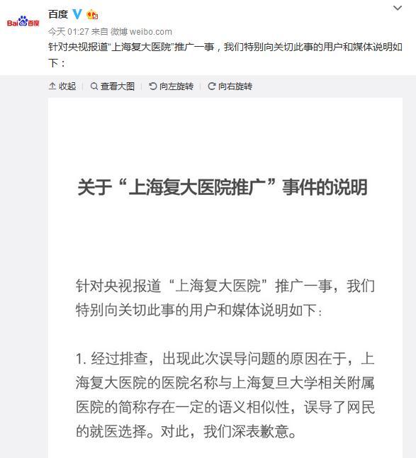 中新经纬客户端9月9日电 针对央视报道患者在百度搜索医院遭遇“冒牌货”一事,百度9日凌晨通过官方微博发布声明称,经过排查,出现此次误导问题的原因在于,上海复大医院的医院名称与上海复旦大学相关附属医院的简称存在一定的语义相似性,误导了网民的就医选择。百度称,对此深表歉意。