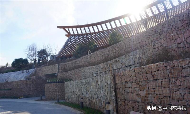 走近后发现,中国馆被层层梯田环绕。梯田紧贴中国馆馆壁堆建,外侧是石笼挡墙,梯田上种植着狼尾草等各类观赏草。