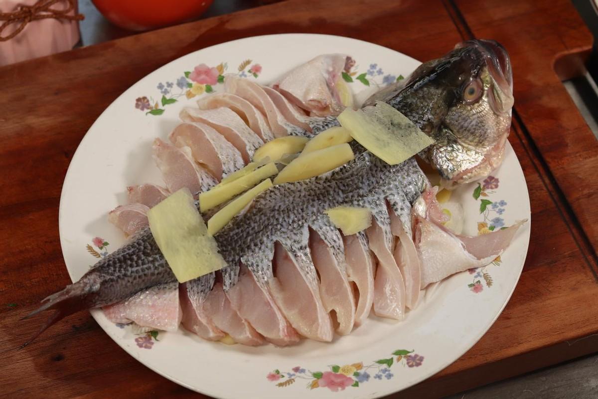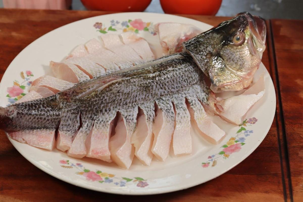 1.准备一条鲈鱼,用清水清洗干净,然后将鱼从鱼腹部用刀划开,再把鱼头和鱼尾切下来,鱼背部用刀划开,再将鱼肚肉切成小条,这样更加入味。