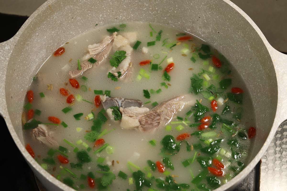 4.时间到,加入枸杞,继续炖10分钟,出锅前放入香菜和香葱就可以了,这样做的羊肉汤,汤白味浓,并且一点也不腥,羊肉也非常的软烂。