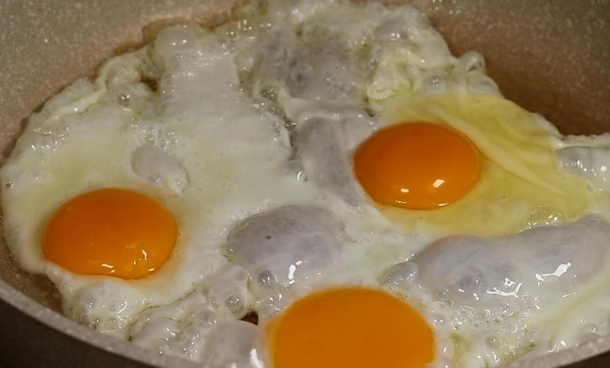 2.碗中打入三个鸡蛋,不用搅散,直接倒入油锅中,将两面都煎至金黄,将鸡蛋饼盛到案板上面,给它切成大块。