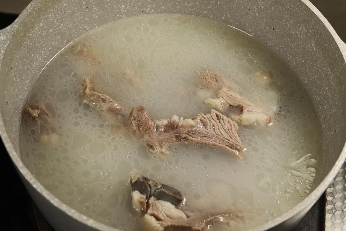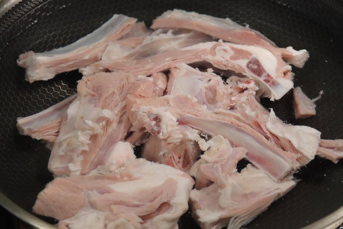 1.准备三斤羊排骨,加入清水浸泡半个小时,泡出里面的血水,将羊肉凉水下锅,放姜片,开中火给它煮开,煮开后撇去上面的浮沫,继续炖5分钟捞出来。