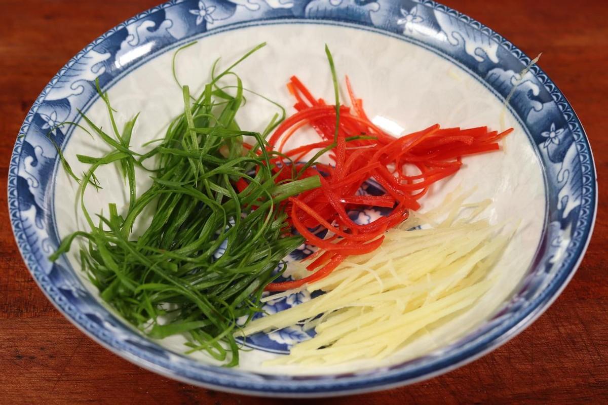 4.葱姜辣椒丝在水里面洗一下,控干水分,这样可以防止炸糊,放在鱼上面,泼上热油,再倒入蒸鱼豉油,一道鲜嫩入味的蒸鲈鱼就做好了。