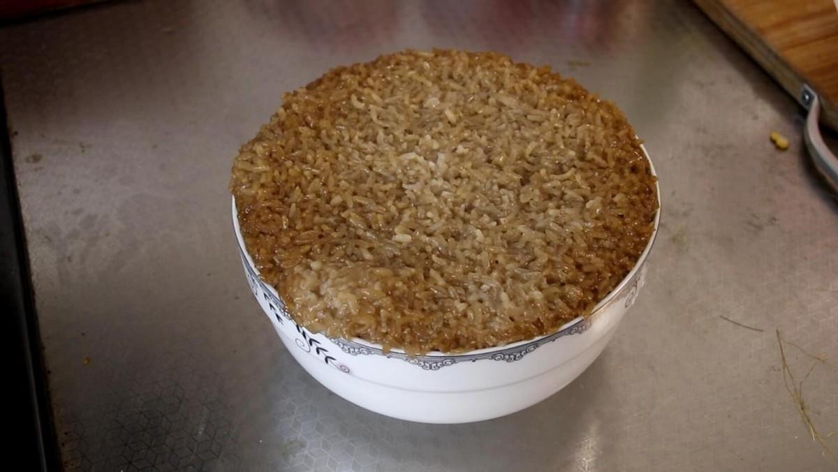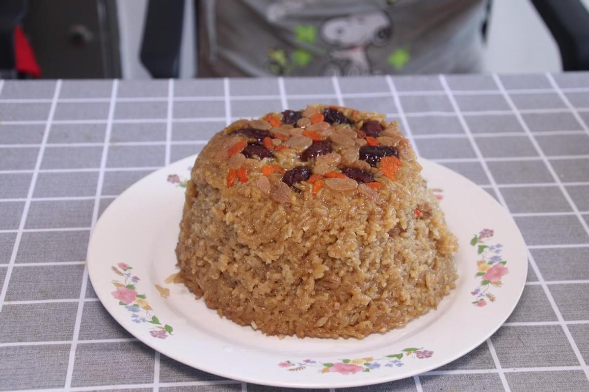 4.这样满满的一大碗,全部按压茨实,然后倒入红糖水,刚好没过糯米就可以了,锅中上汽之后,放入锅中,大火蒸四十分钟,糯米饭蒸好之后,准备一个盘子扣起来,翻过来,一道又糯又甜的糯米饭就做好了。
