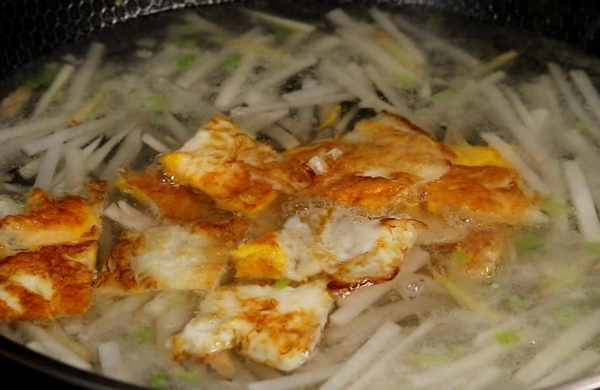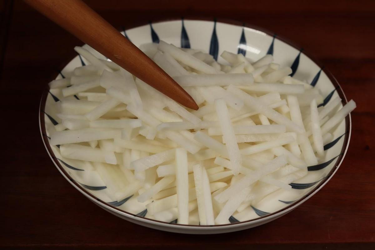 1.先准备一根白萝卜,将萝卜的头尾去掉,先将萝卜切成厚片再切成丝。萝卜丝不要太细,影响口感还容易煮烂。