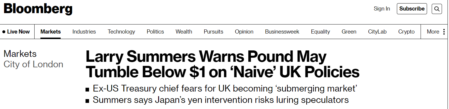 在接受彭博社采访时,前美国财长萨默斯评论道,英国现在追求的是“幼稚的(naive,)、一厢情愿(wishful-thinking)的供给经济学”,不合时宜。“如果维持当前的政策路径,英镑汇率最终会跌破1美元。”