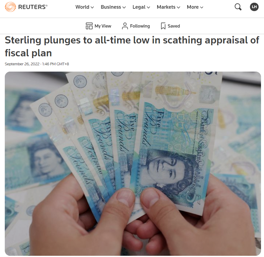 综合路透社和英国广播公司消息,在今日(9月26日)亚洲早盘交易中,英镑兑美元汇率大幅下跌至1971年以