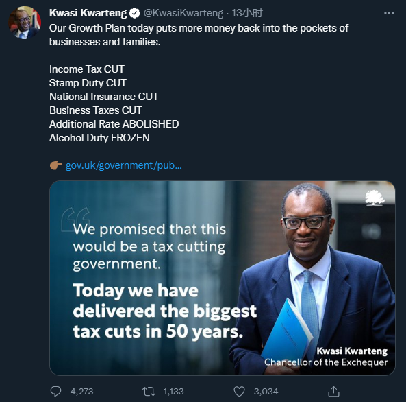 据《金融时报》报道,英镑此次遭受重创,很大程度上和英国财政大臣科沃滕(Kwasi Kwarteng)的减税政策有关。在上周五官宣450亿英镑减税计划后,科沃滕周日进一步表示,“还会有更多措施出台。”
