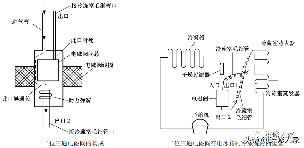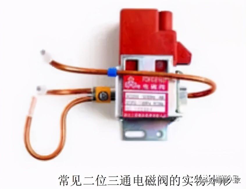 常见的二位三通电磁阀的实物外形如图,内部构成如图,在电冰箱制冷系统内的位置图如下所示。