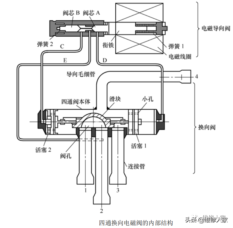 如下图所示,四通换向电磁阀由导向阀和换向阀两部分组成。其中,导向阀由阀体和电磁线圈两部分组成。阀体内部设置了弹簧、阀芯、衔铁,阀体外部有 C、D、E 3 个阀孔,它们通过C、D、E 3 根导向毛细管与换向阀连接。四通换向电磁阀的阀体内设有半圆形滑块和两个带小孔的活塞,阀体外有 4 个管口,它们分别与制冷系统中压缩机的排气管、吸气管、室内外热交换器连接。