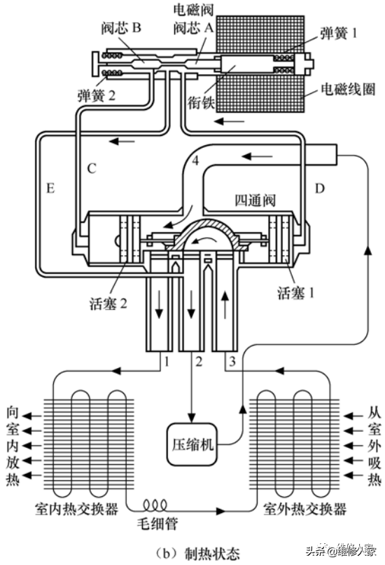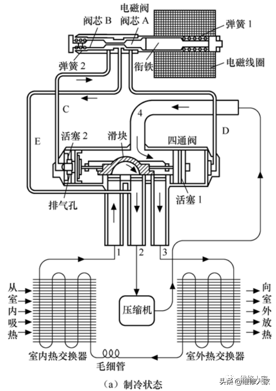 如下图(a)所示,当空调器设置为制冷状态时,电气系统不为导向阀的线圈提供驱动电压(脉冲信号),线圈不能产生磁场,衔铁不动作。此时,弹簧 1 的弹力大于弹簧2,推动阀芯A、B一起向左移动,于是阀芯A使导向毛细管 D关闭,而阀芯B使导向毛细管 C 与 E 接通。由于换向阀的活塞2通过C 管、导向阀、E管接压缩机的回气管,所以活塞2因左侧压力减小而带动滑块左移,将管口4与管口3接通,管口2与管口1接通,此时室内热交换器作为蒸发器,室外热交换器作为冷凝器。这样压缩机排出的高压高温气体经换向阀的管口4和管口3进入室外热交换器,利用室外热交换器散热,再经毛细管进入室内热交换器,利用室内蒸发器吸热汽化后,经管口1和管口2构成的回路返回压缩机。至此,一个制冷循环过程结束。