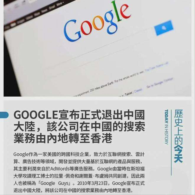 2010年3月23日,谷歌宣布停止对谷歌中国搜索服务的“过滤审查”,并将搜索服务由中国内地转至香港。