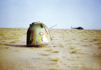 神舟五号返回舱着陆在草原上。