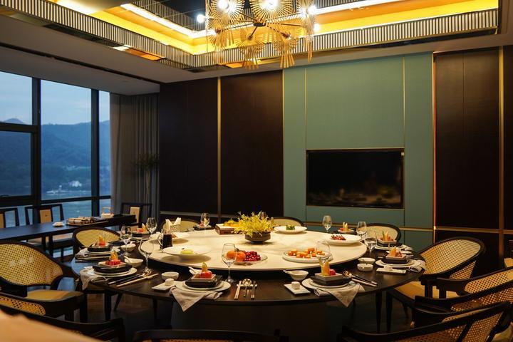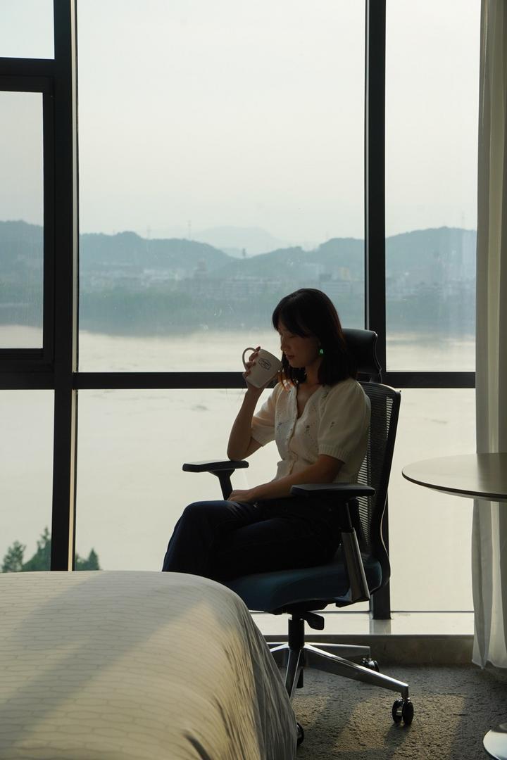 房间有全景,落地玻璃窗可以坐在窗边俯瞰富春江的美景。正值夕阳西下,落日的余晖洒在富春江面上。反射出的光芒十分耀眼。