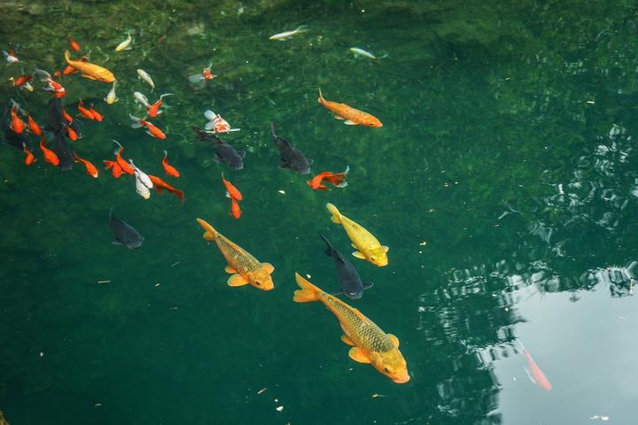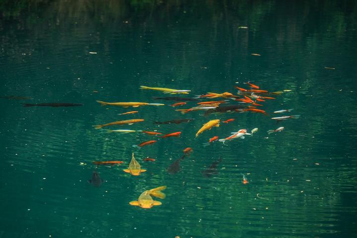 水的颜色绿得很透彻。柳宗元在《小石潭记》描写过“潭中鱼可百许头,皆若空游无所依”,便可以描绘这样的场景。潭水太清澈,所以潭水里的鱼,仿佛游在空中。