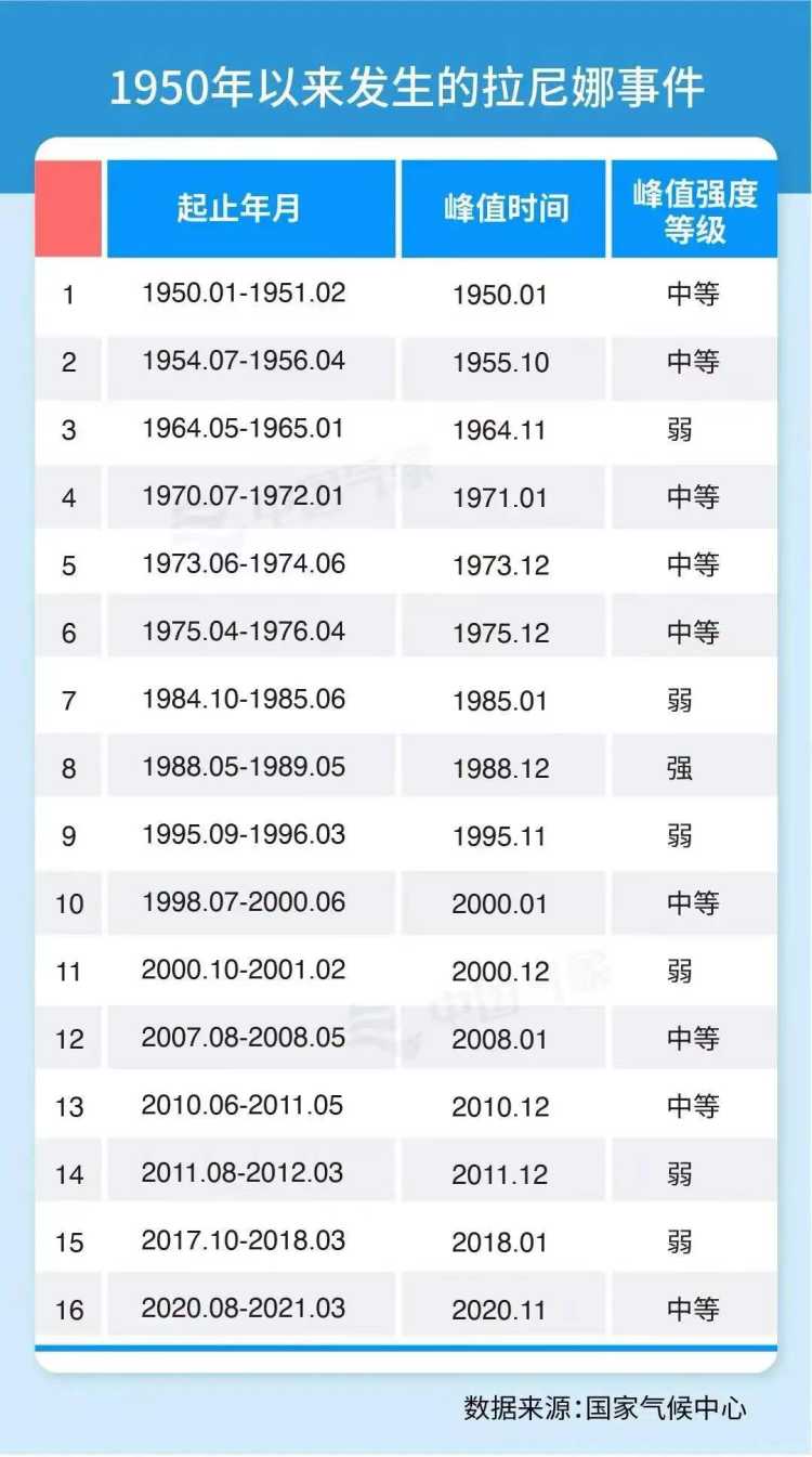 1950年以来发生的拉尼娜事件。/ 国家气候中心