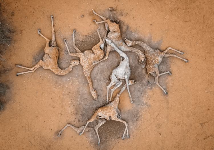 美国记者埃德·拉姆(Ed Ram)在肯尼亚一处野生动物保护区干涸的水库内,拍摄到6只死去的长颈鹿。照片中,它们呈螺旋状交织着躺倒在地。