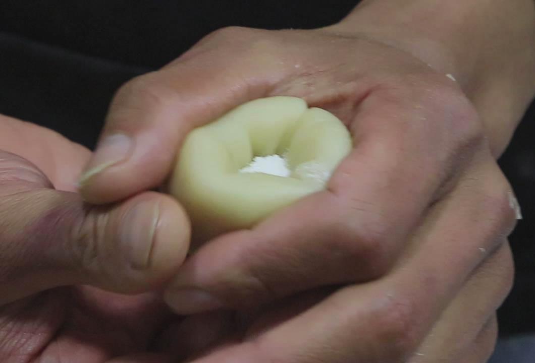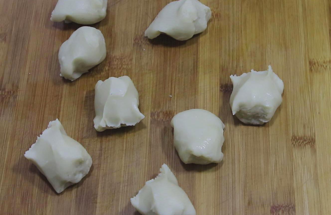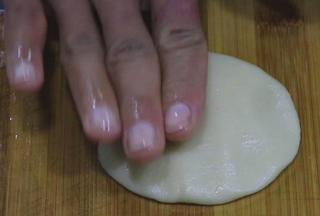 6、把剂子放在手心,揉成光滑的小圆球备用,全部揉好后,把剂子压成片,用大拇指把面片中心摁压一下,放入一勺糖馅,把面片放在虎口处,不断转动面片,收紧开口 ,收到最后,揪下一块面团。这样可以防止漏糖。