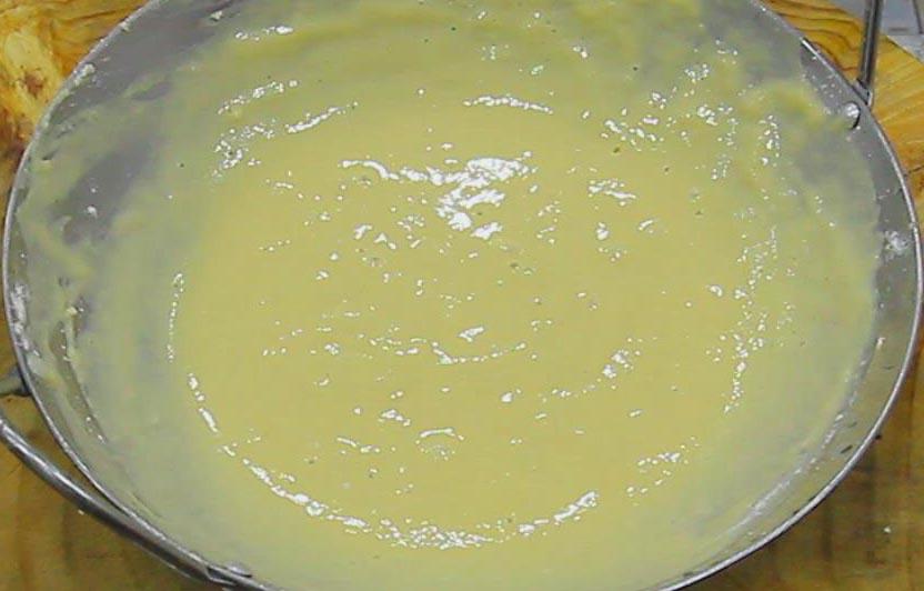 7、面剂都包好糖糕馅后,再给面剂涂一层植物油,案板上再刷油,放上面剂,手上粘油,把面剂压成薄片,小心不要把糖糕馅挤压出来,植物油能使炸出的糖糕起酥。