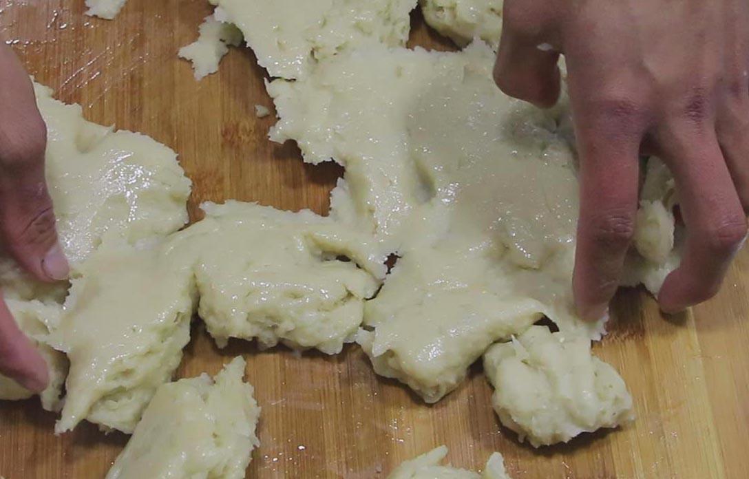 5、把晾好的面片揉在一起,反复搓揉,揉成长条,然后把长条一分为二,取一半继续揉搓,揉成细条,揉好以后,用手揪成大小均匀的剂子。