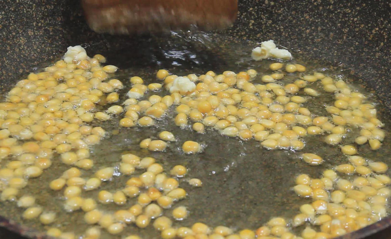 3、倒入准备好的玉米粒,翻炒一会,玉米粒会逐渐炸开,用锅盖盖住,迅速的晃动锅,让玉米粒均匀受热,同时也防止玉米粒粘在锅底。