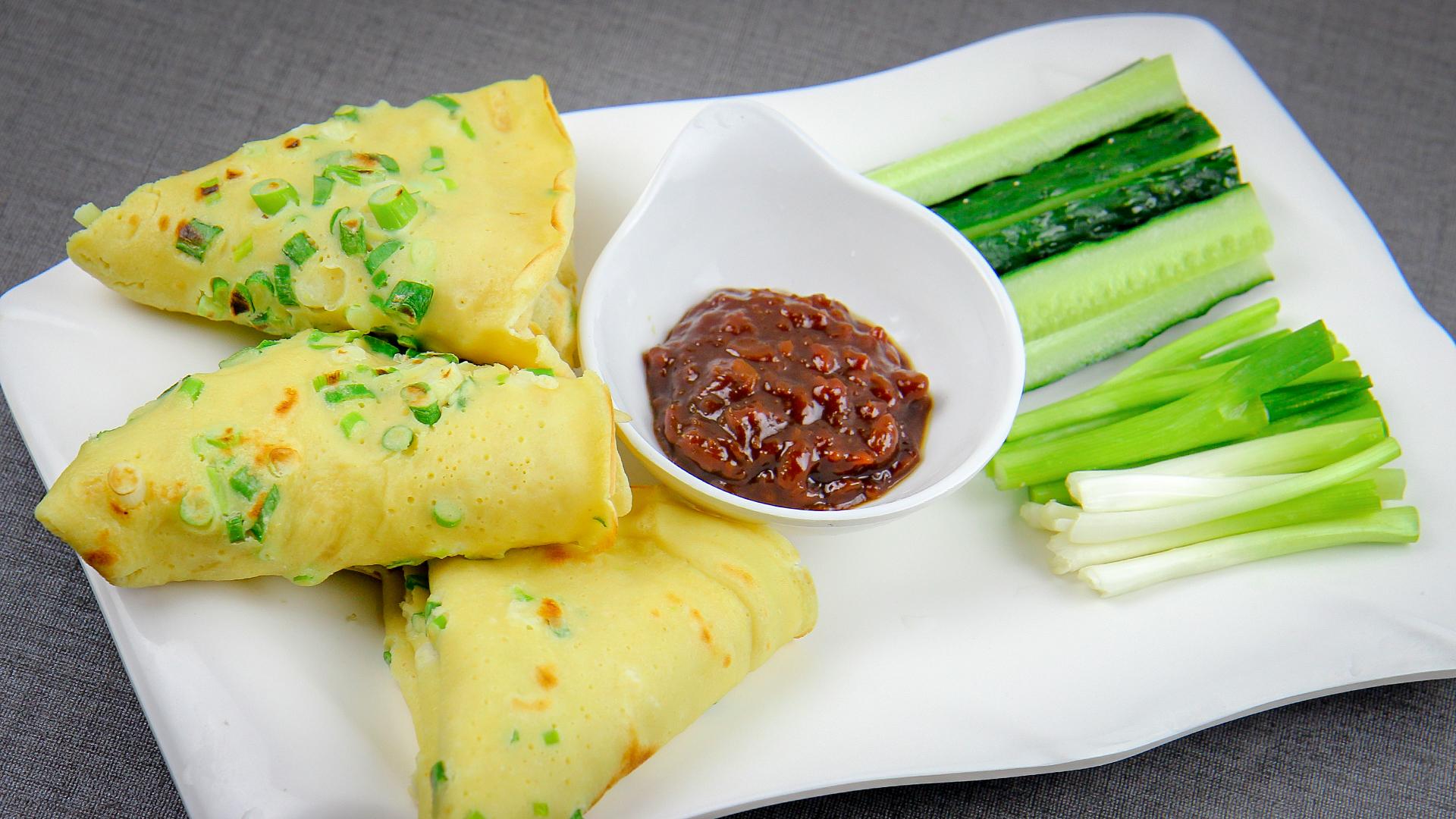 4、把所有的面糊都烙成小饼,放在盘中备用。接着,我们切一点葱白和黄瓜段,放在盘中。烙好的饼叠成三角块也放进去,再准备一点自己喜欢的蘸酱,美味即成。