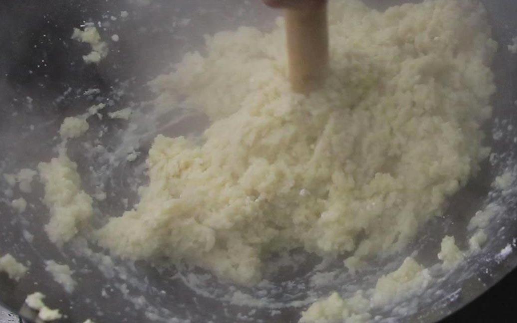 2、锅内烧水,烧开以后不要关火,把搅拌好的面粉倒入锅中,一边倒面粉一边用面杖不停搅拌,面粉遇热变黄并粘连在一起,不停朝一个方向搅拌,搅拌到没有干面粉,把火关掉。
