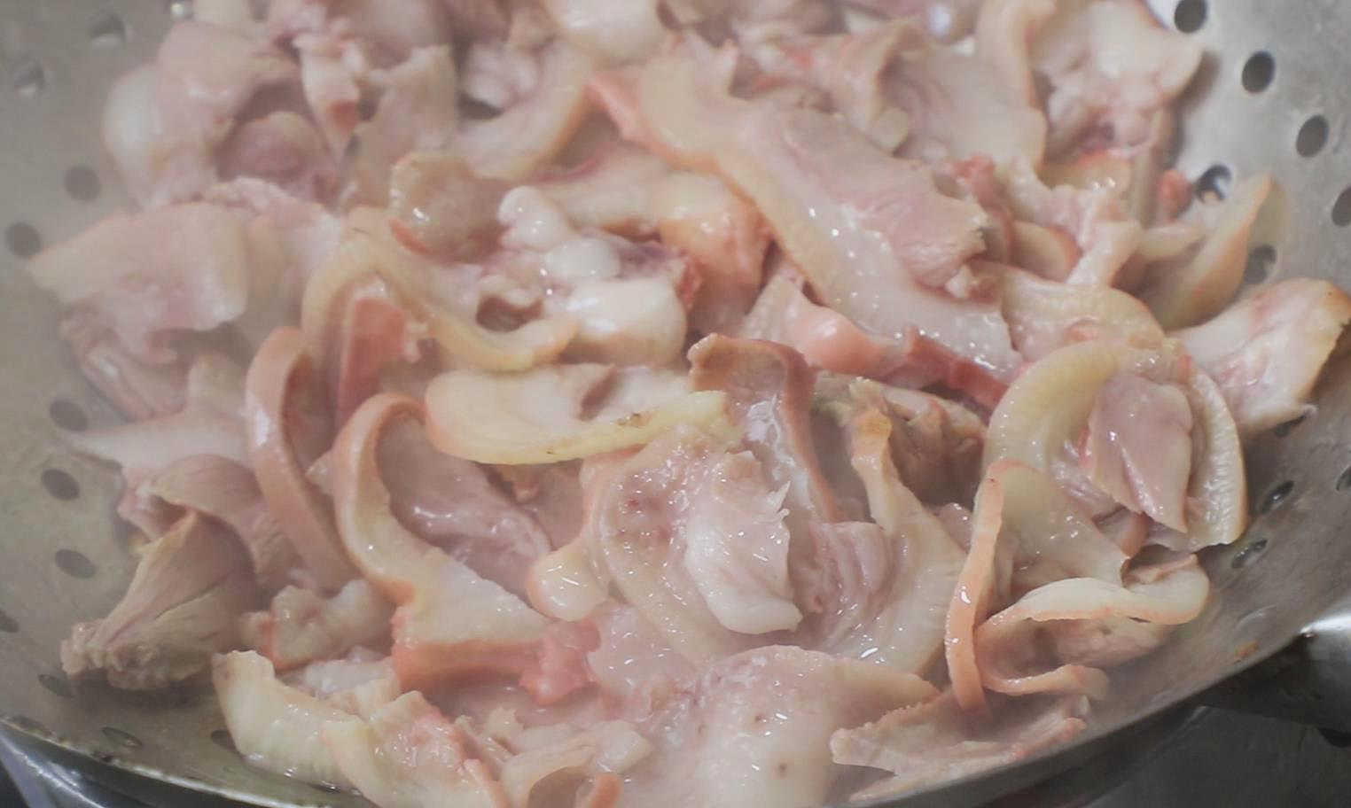 3、接着,我们把猪头肉快速滑一下油。锅内烧油,油温六成热,油面接近冒青烟,倒入控干水分的猪头肉,快速滑油10秒钟,倒出控油。滑油的目的是激出猪头肉中多余油脂。