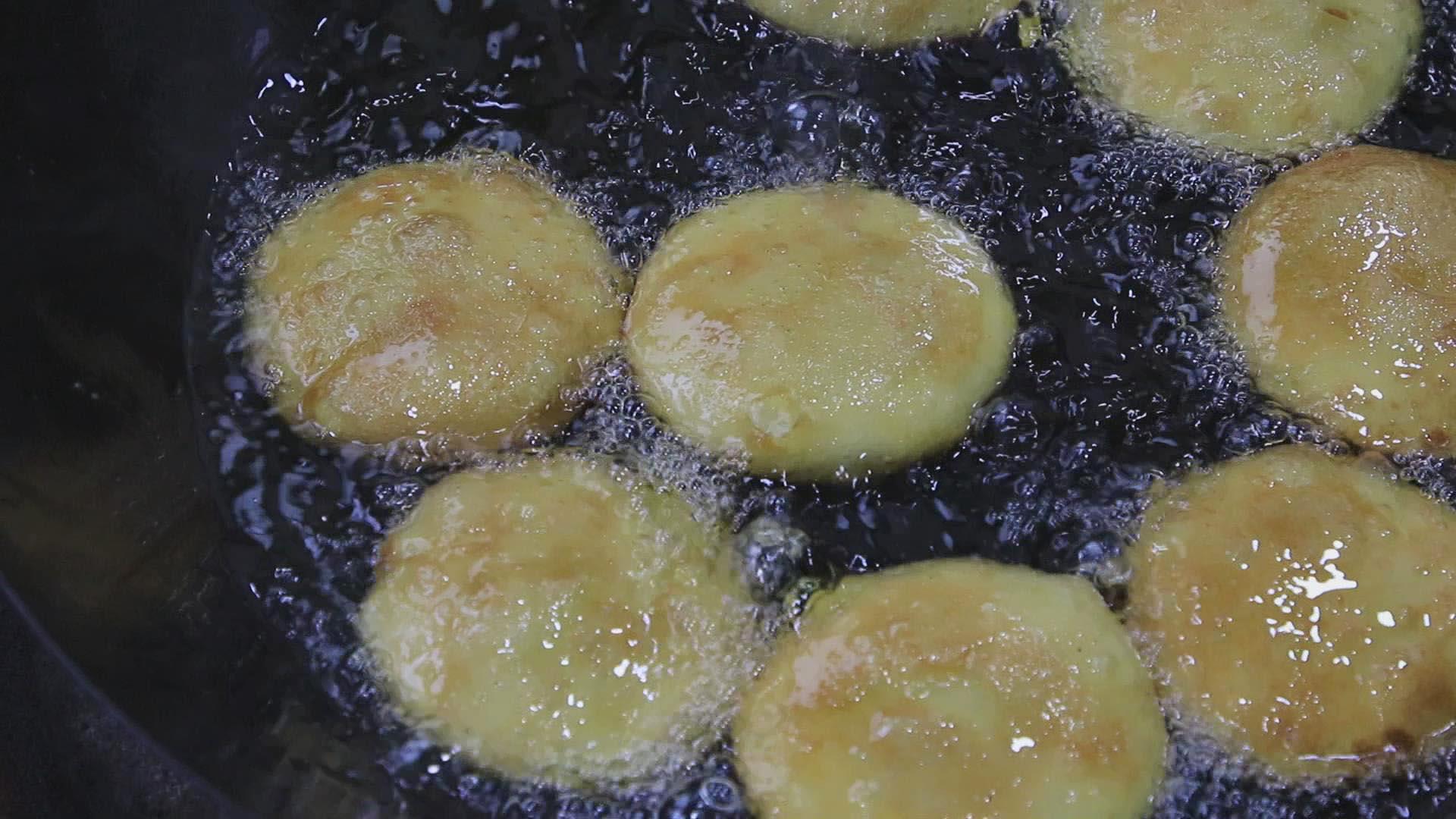 8、锅内烧油,油温4成热时,把糖糕沿锅边逐个下入锅中,糖糕遇热快速定型,不停晃动炒锅,并用勺子轻轻翻动,既能防止糖糕粘在锅底,又能使糖糕受热均匀。小火炸3分钟,糖糕全部浮上来,即可捞出控油,上桌食用了。