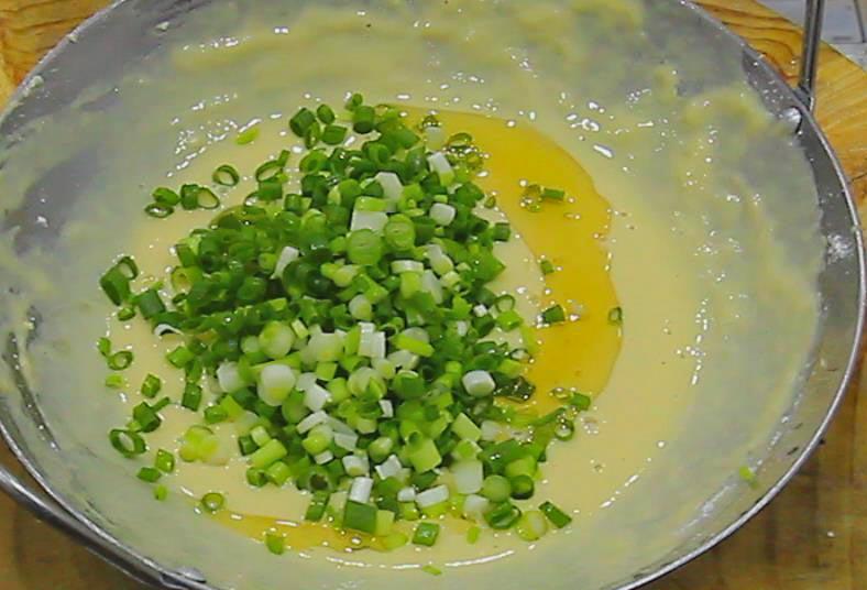 2、面糊不要太稠,烙饼的时候不容易摊开,然后淋入一点植物油,植物油能使烙出来的饼更加柔软。放入准备好的葱花拌匀,就能开始烙制了。