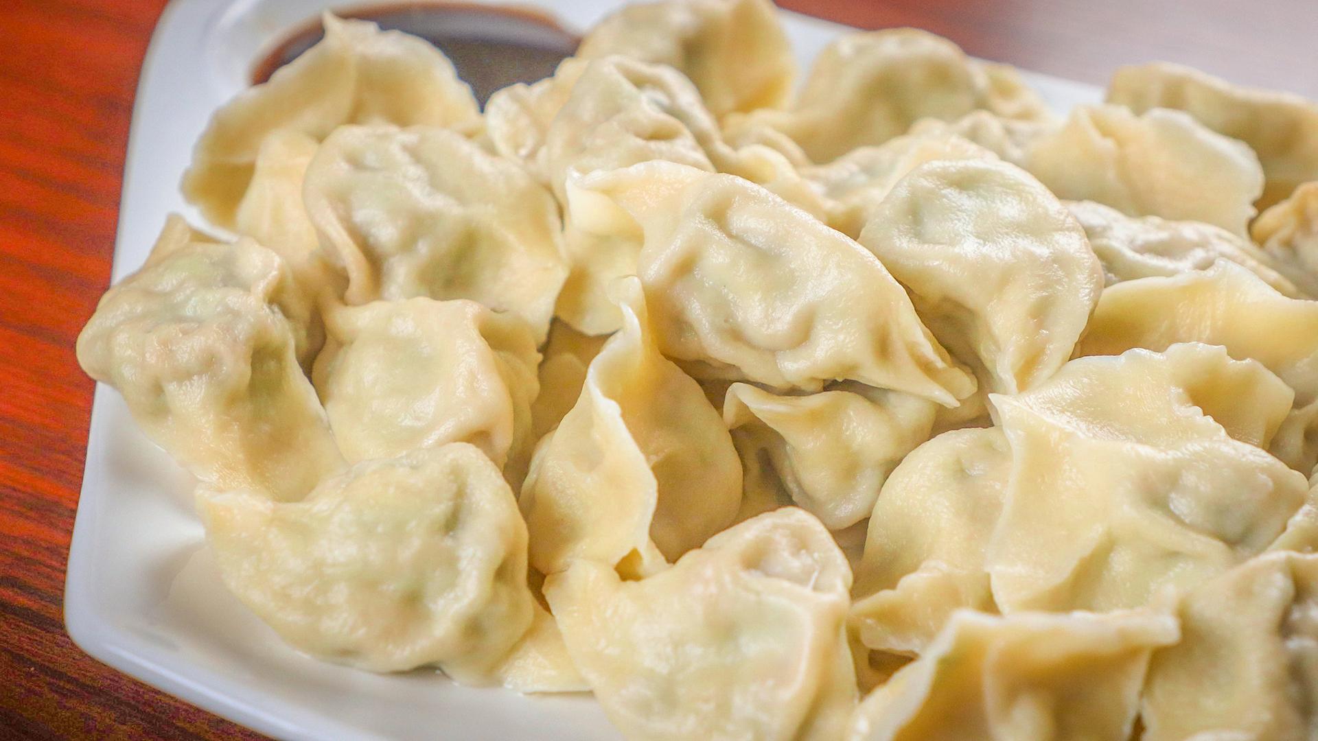 3、准备四周薄,中间厚的饺子皮,按照自己的手法包成饺子。在饺子皮上放入适量馅料,把面片对折放在虎口处,大拇指用力一挤,饺子就包好了。