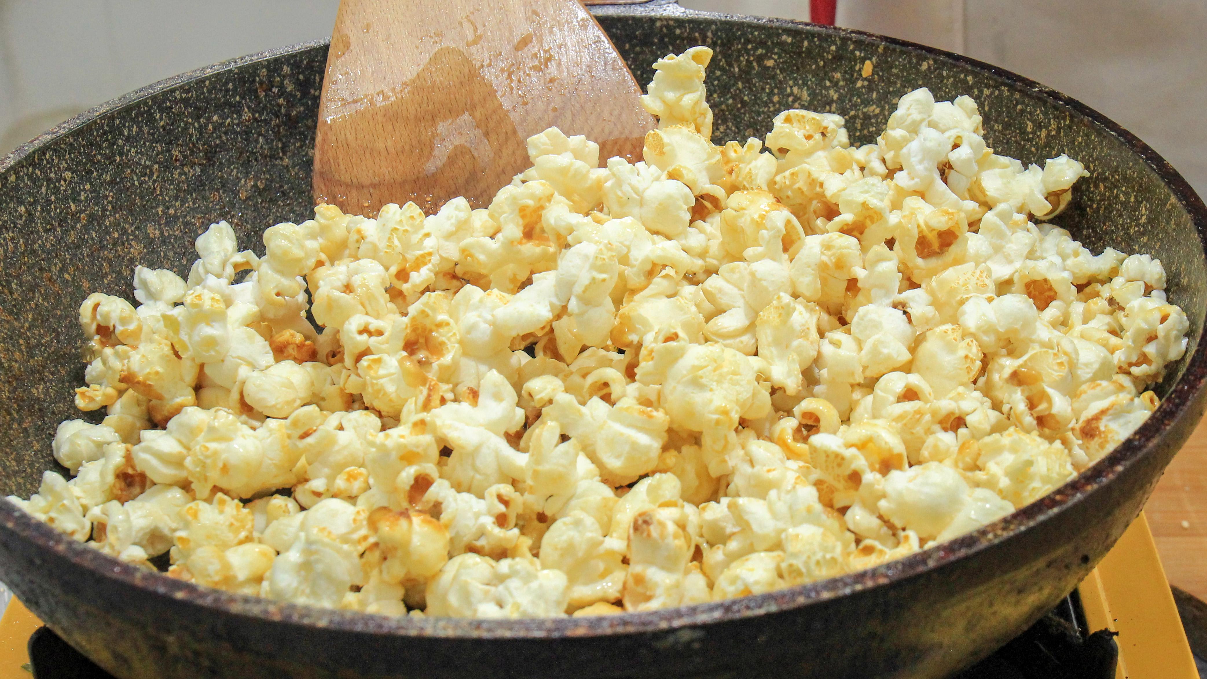 4、随着不停的加热,炸裂声越来越密集,炸裂声逐渐消失以后,打开锅盖,爆米花就炸好了。爆米花出锅后要快速的晾凉,不然会失去焦脆的口感。