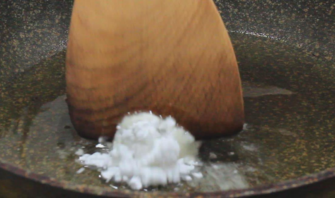 2、起锅开小火,加入适量的植物油,油的量和平时炒菜的量一样即可。油温微热时,加入一勺白糖,把白糖炒化,喜欢吃甜一些的,可以多加一点糖。