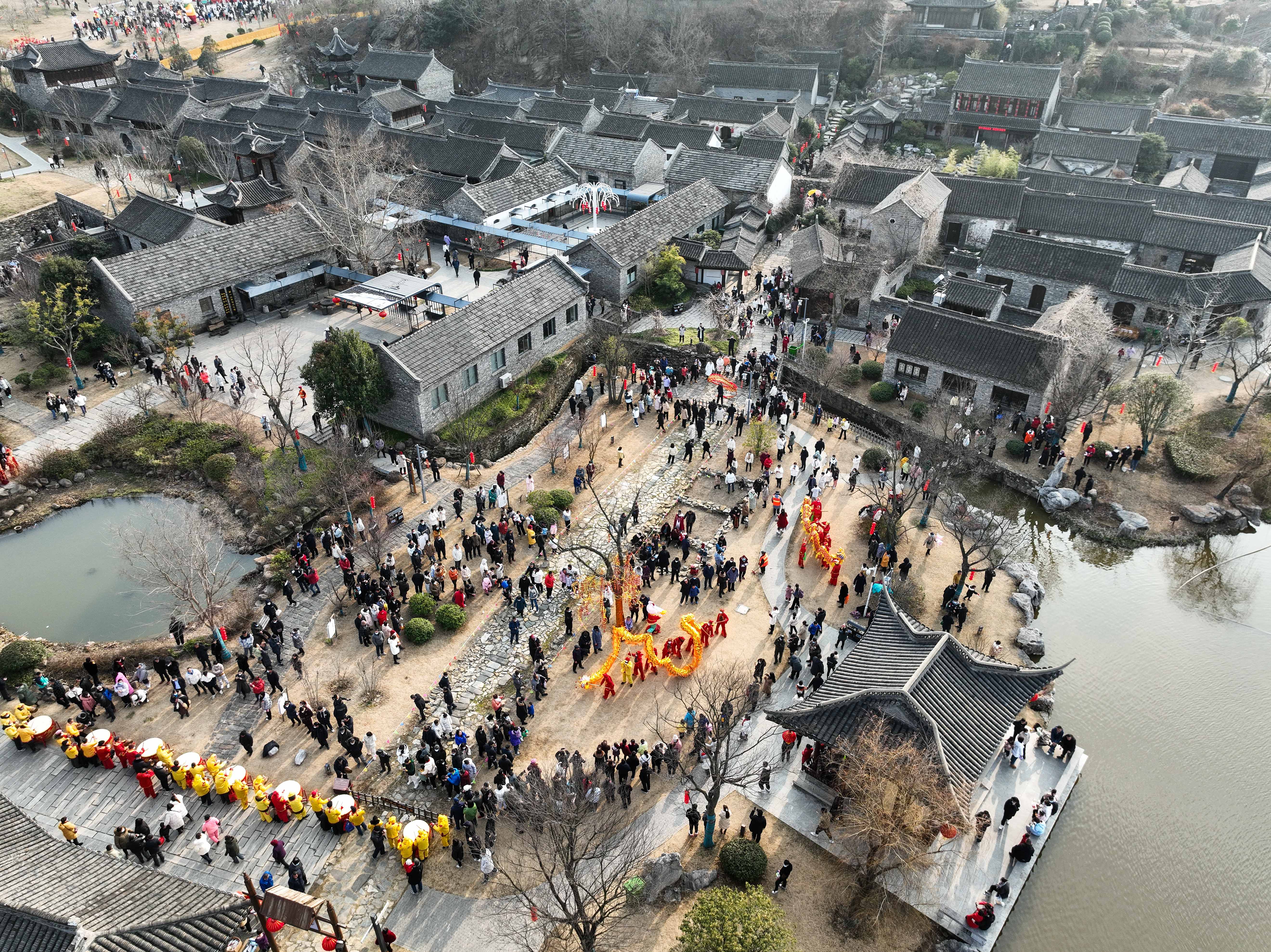 1月23日,市民和游客在盱眙第一山历史文化街区观看舞龙表演(无人机照片)。 新华社记者 季春鹏 摄