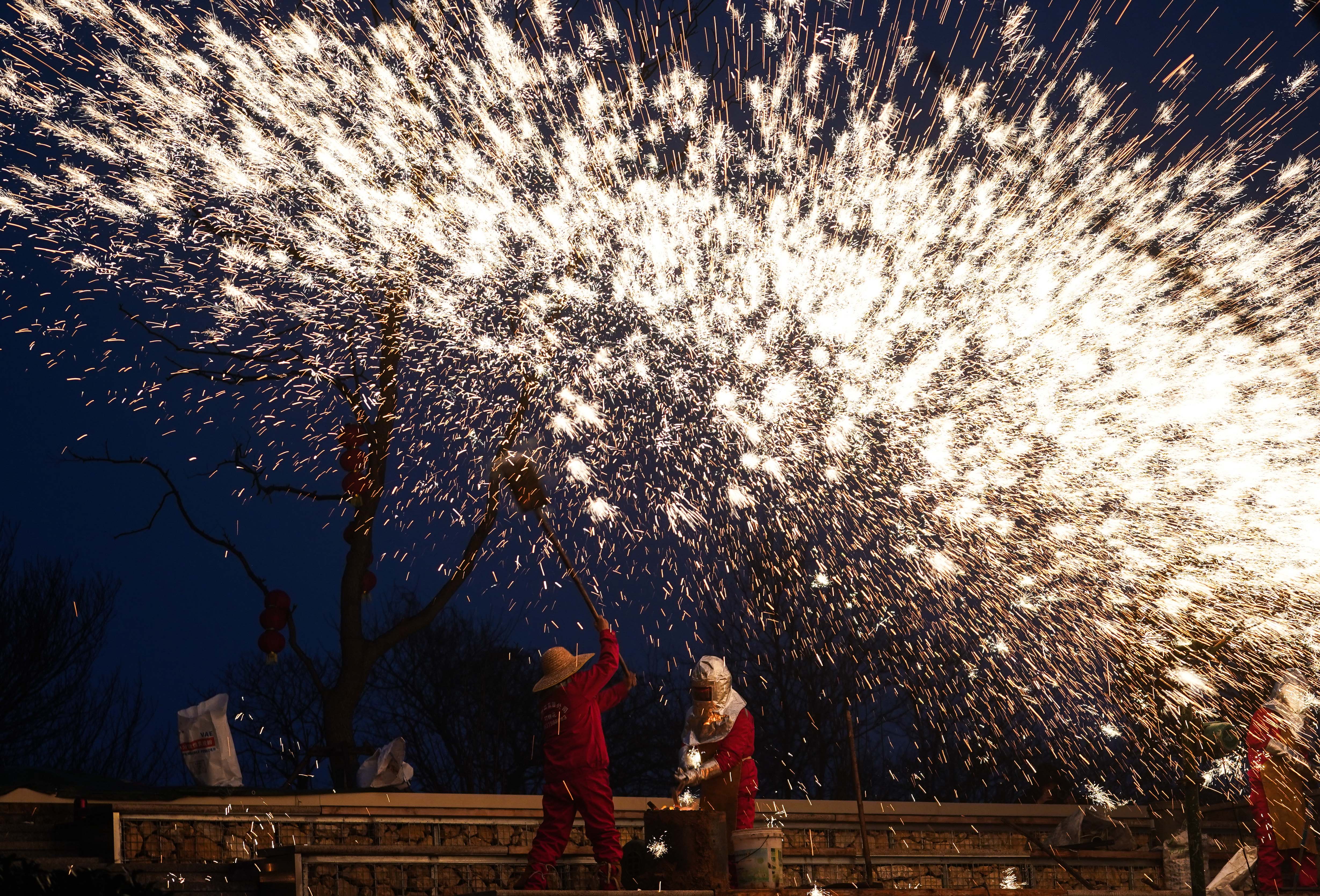 1月23日,民间艺人在盱眙第一山历史文化街区打铁花。 新华社记者 季春鹏 摄