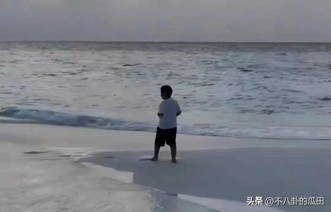 视频拍摄了大全景,远处是浪花朵朵的大海,佟丽娅和儿子朵朵一起手拉手走在海边,佟丽