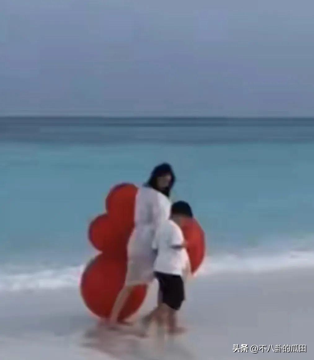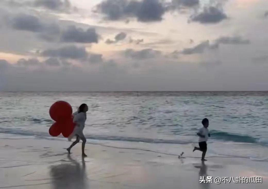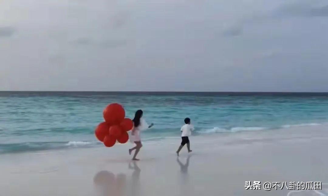 视频拍摄了大全景,远处是浪花朵朵的大海,佟丽娅和儿子朵朵一起手拉手走在海边,佟丽娅手里拿着红色的气球,母子俩都穿着浅色的服装,和红色的气球相互映照,煞是好看。