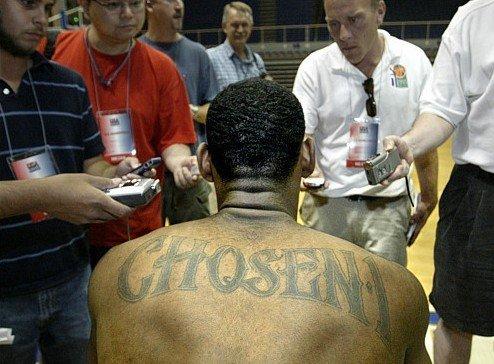 T:tattoo(纹身)像艾弗森、安德森等球员一样,詹姆斯也是一个纹身的爱好者,詹姆斯的纹身,霸气十足。纹身是一种个性,是一种信仰、态度。他后背的纹身“天选之子”很好的体现了他的王者风范。