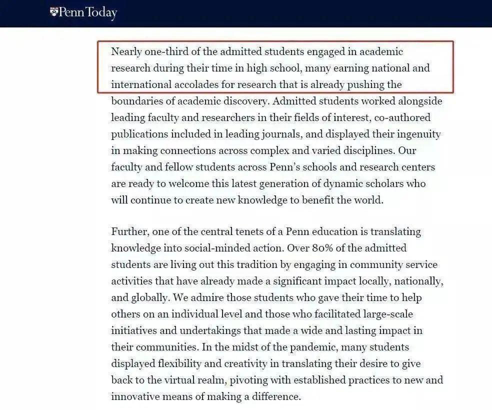 常青藤名校宾夕法尼亚大学就明确指出, 其本科新生中有1/3在高中阶段就已经有学术研究经历了(academic research)。