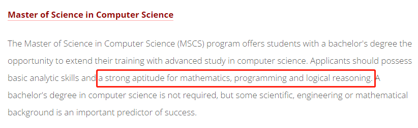 而卡内基梅隆大学的计算机科学硕士则指出,学生需具备 数理和逻辑推理能力, 还需要具备创新能力和实验能力 。